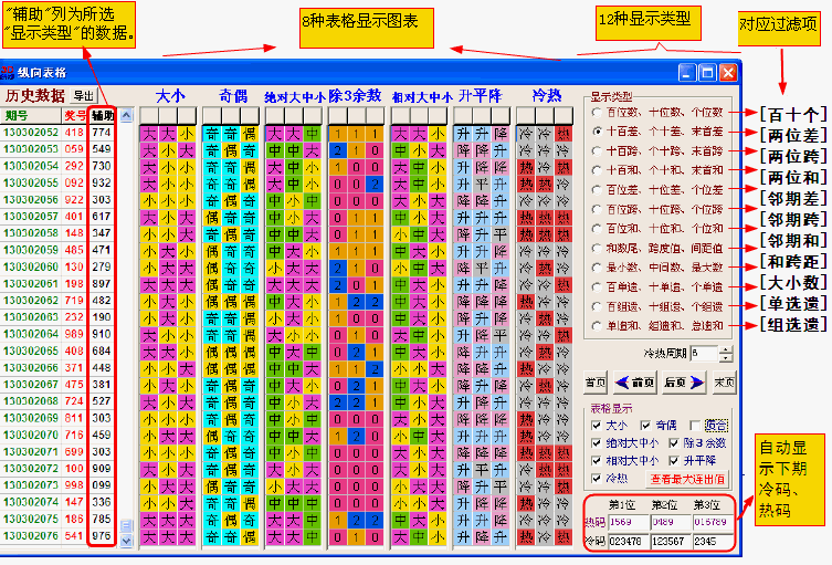 纵向表格提供12种显示类型,具体数据显示在辅助列,并配有大小、奇偶、质合、绝对大中小、除3除数(012路)、相对大中小、升平降、冷热8种表格显示,每个类型及对应表格都可以在相应的筛选条件进行缩水设置。纵向表格界面如下图: