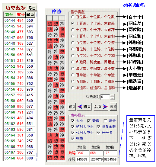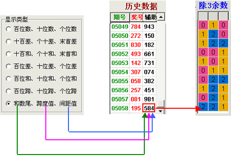 如下图,当选择的显示类型为 “和数尾、跨度值、间距值” 时,历史数据表格的辅助列的第一位数字为和数尾,第二位数字为跨度值,第三数字为间距值。例05058期开奖195,辅助列为584,意义为05058期的合数为5,跨度为8,间距为4。对应的除3余数排列为221。
