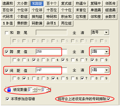 可以在缩水设置界面的筛选条件[和跨距]过滤项里来设置,跨度选2路(即余2)2,5,8,间路值选1路(余1)1,4,7,锁定数定2-2,并将符合上述条件号码排除打勾,视图如下,即可排除124注。:
