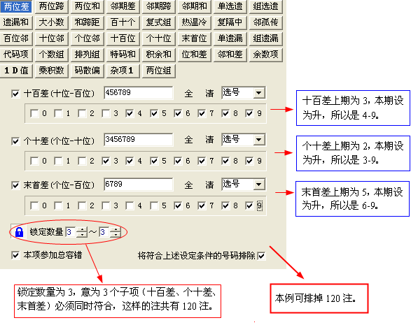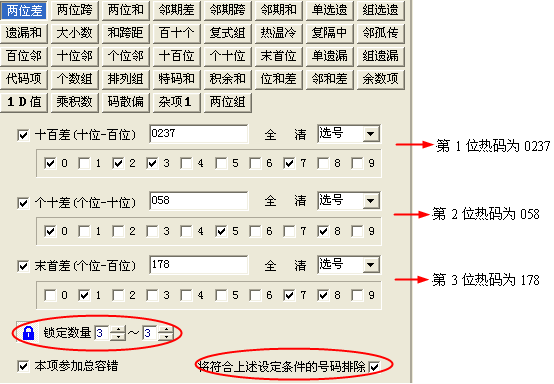 当排除“*热热”形式时,第1位(十百差)不作任何设定(前边的勾取消)。另2位同上所设。锁定数据设为2-2可2-3都可。