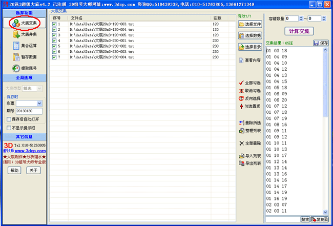 本系列软件提供的六大功能模块分别为:大底交集、大底并集、集合运算、暂存数据、拆分、合并3D号(4D版,5D版,6D版,7D版均支持、尾数提取(乐透型彩种均支持)。其中,大底交集功能支持多个大底的容错交集;大底并集功能适用于把多个大底累加合并到一起;集合运算功能提供两个集合之间的全部5种运算方式:求同(交集)、求异、相加(并集)、相减A-B和相减B-A;暂存数据部分提供了21个文本框可以用来暂时存放一些数据,鼠标的右键菜单提供了与文本框相配套的 全选、剪切、清空、单组转换、载入、保存、搜索取反等19项强大功能并支持容错功能。