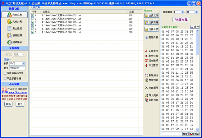 本系列软件提供的六大功能模块分别为:大底交集、大底并集、集合运算、暂存数据、拆分、合并3D号(4D版,5D版,6D版,7D版均支持、尾数提取(乐透型彩种均支持)。其中,大底交集功能支持多个大底的容错交集;大底并集功能适用于把多个大底累加合并到一起;集合运算功能提供两个集合之间的全部5种运算方式:求同(交集)、求异、相加(并集)、相减A-B和相减B-A;暂存数据部分提供了21个文本框可以用来暂时存放一些数据,鼠标的右键菜单提供了与文本框相配套的 全选、剪切、清空、单组转换、载入、保存、搜索取反等19项强大功能并支持容错功能。