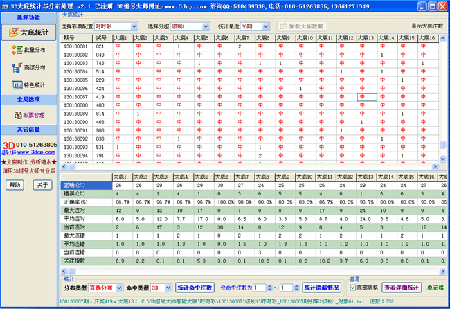 为方便3D组号大师专业版软件的用户,本软件还提供了“特色统计”功能,可直接对3D组号大师专业版产生的“一键24底”进行特色统计,直观显示各大底的命中级别以及各级别的命中情况,并自动统计各大底的往期命中规律,如“最大连错”、“最大连对”等重要参考数据,实现对3D组号大师专业版的智能大底的更加有效的利用!