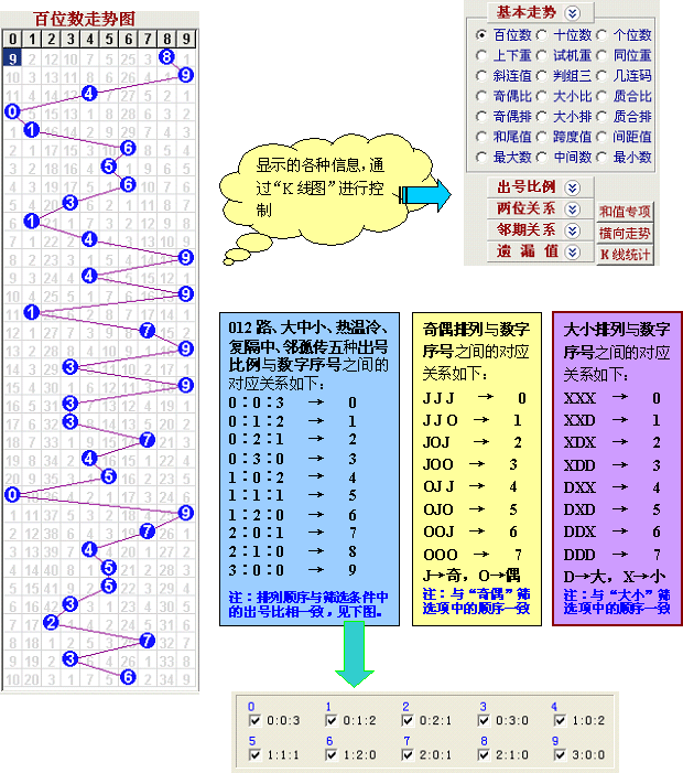 可直观地显示出各种信息的分布走势。分为“基本走势”、“出号比例”、“两位关系”、“邻期关系”、“遗漏值”五大类,3D组号大师专业加密锁版主界面的K线图有53种(不包括和值专项及附加走势等),并且全面支持横向显示和K线图数据统计。