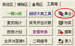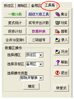 工具箱。提供很多超强实用的特色功能,是博彩的必备帮手。包括:“一键24底推荐”“超级大底工具”、“复式统计”、“集合运算”、“奖号开出次数统计”、“3D合并排5”、“二码组号”、“投资计划表”、“数据转换”、及“对奖”等等。