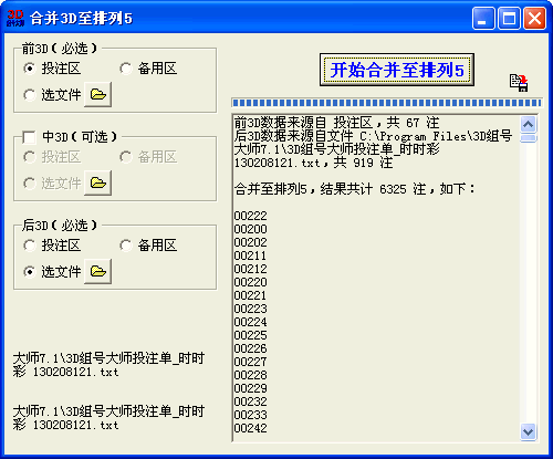 下图演示的前3D(67注)、后3D(919注)经合并后,仅有排列5号码6325注,而全部排列5为10万注。如果前3D和后3D命中3D的话,则排列5开奖号即存在于合并后的6000多注结果中,大大降低注数。