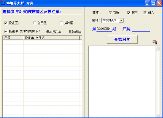 用于多投注单、多数据区的搜索对奖。先选好参与对奖的投注单文件及数据区,然后输入开奖号,再点“开始对奖”即可。