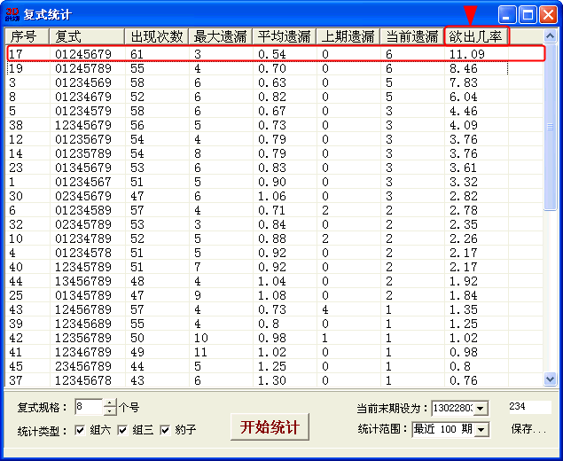 使用技巧:单击标题列“欲出几率”后按欲出几率的大小排列显示,欲出几率最大的,表示下期最有可能中出的复式,可以直接设到筛选条件“复式组”里进行缩水杀号。见下图: