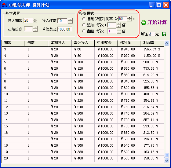 1、自动保证利润率模式。计算在保证利润的情况下,每期应倍投的倍数。