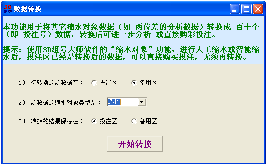 本功很方便将其它缩水对象的分析结果,转成百十个直接投注号,待转换的源数据的缩水对象类型支持:两位差、两位跨、两位和、邻期差、邻期跨、邻期和、单选遗、组选遗、遗漏和、和跨距。