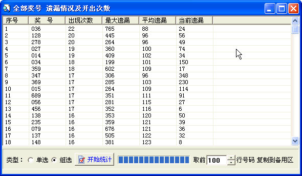 可以统计全部号码(1000注单选或220注组选)的遗漏情况。单击列标题可以排序,方便您统计每个奖号的开出情况,并通过统计可以将要排除的前多少行号码,复制到备用区,以备做号时使用。