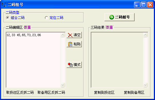 2、在 二码编辑区 可以输入或粘贴二码,也可以取自投注区或备用区的三码反拆出来的二码。