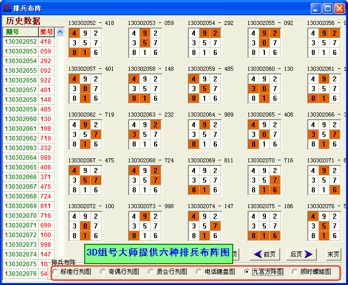 顾名思义,排兵布阵是指在特定排列的方图中查看奖号的分布情况,推敲下一期的可能分布特点。分“标准行列图”、“奇偶行列图”、“质合行列图”、“电话键盘图”、“九宫方阵图”、“顺时螺旋图”六种。