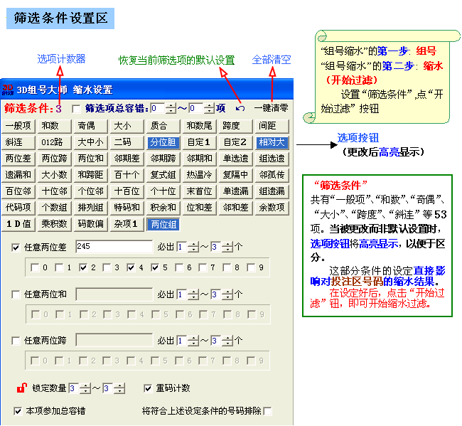 单码过滤,可将包含某些特定数字的号码提取出来或排除掉。典型的用法是在1D变3D中,1D变3D操作通常有两种方法实现,一种是先设置总条件(大条件),将1000注缩水至200来注,再从中依次提取出0-9十个单码。另一种方法是对每个胆码分别设置条件,单独来实现。