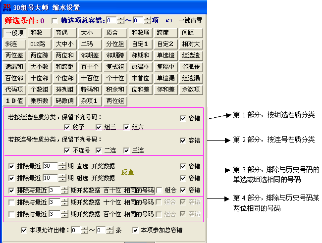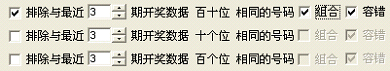 第3部分,对历史数据的过滤可分为直选(单选)过滤和组选过滤。可以指定排除最近多少期开过的单选或组选。