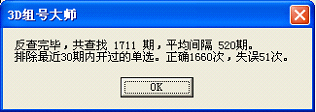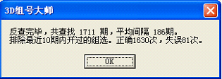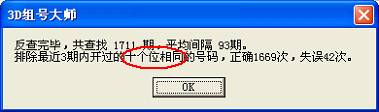 如下,是设定了第3部分,排除最近10期开过的组选,点“反查”钮后出现的对话框,以后主界面的历史表格结果。