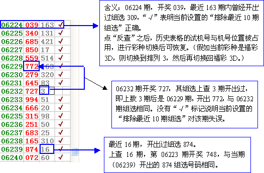 “反查”功能可以针对第3,第4部分的设定对历史数据进行反查,观察当前设定在历史开奖中的正确情况,如果当前设置对该期正确,会在机号的位置打上“√”标记。