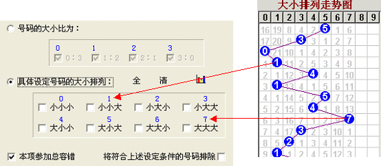 可设定号码的大小比,及大小排列。0-4为小,5-9为大。其中大小排列的序号与走势图是对应的。