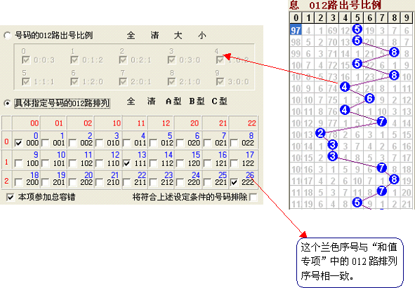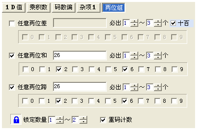 如奖号517,它的两位跨为462,两位和为682,下图为条件“任意两位和跨为26”的设置方法: