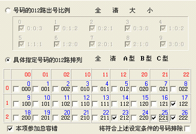 可直接勾选出号比例0:0:3和0:1:2,或如下图,勾选222、122、212、221型,勾选“将符合上述设定条件的号码排除”,过滤后可直接排掉108注。