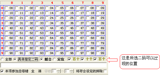 定位二码,两个数字的前后顺序是固定的。如定位二码49,出现在百十位时为49*,出现在十个位时为*49,出现在百个位时为4*9。