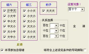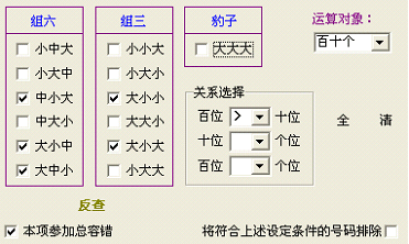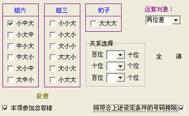 使用“关系选择”时,须先点“清”按钮将所有选择清空,再点“关系选择”中的相关下拉框选择一种大小关系,将自动把符合所选位间大小关系相符合的类型打勾。