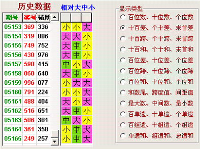 如下图,当纵向表格的显示类型为“十百差、个十差、末首差”时,相对大中小的类型已经连续两期为“小中大”,第05166期想排除“小中大”类型。