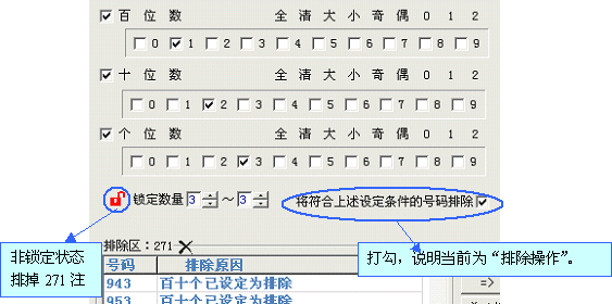 当“排除”时(“将符合上述设定条件的号码排除”打勾),只要28、27、78三个二码中的任何一个打了勾,号码287都将会被排除掉。