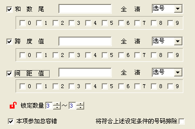 8、间距:设定间距范围及间距点数。间距的计算举例,号码571,前两位的间距为7-5=2,后两位的间距为7-1=6,则号码571的间距值为6-2=4。同理,571的间距值为4;751的间距值为2。