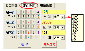 2)定位投注。可进行“百、十、个”位的直选设置,点“选号”菜单,可以按菜单里的选项进行设置每个位置。见下图: