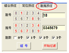 3)胆拖投注。可以进行“胆号”和“拖号”选择设置,还可以在“胆数”项里设置出几个胆。见下图