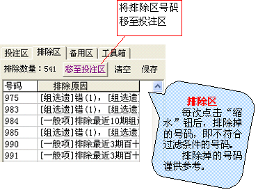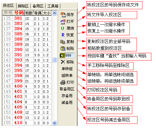这里保存的是点“组号”后根据您设定的“筛选条件”所组出的号码,每次点击“开始过滤”钮,都是对此区号码进行缩水过滤操作。这里的号码也是您最后可能要投注购买的号码,下图详细介绍投注区右侧菜单功能。