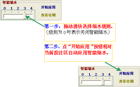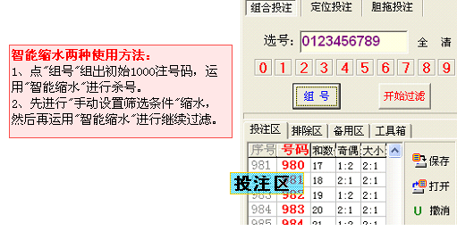在智能缩水的级别不为0时,点“开始应用”按钮即对当前投注区进行智能缩水操作。当需要利用缩水条件设置进行人工缩水时,设置完条件后直接点“继续过滤”按钮即可,智能缩水可以和人工缩水互相配合使用,效果更好。