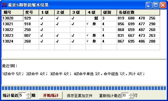 往期的正确情况可点击“查看往期”进行统计中出级别,各级注数等,下图是统计结果,1级智能缩水800注左右的大底,5中5;4级智能缩水200多注,5期中3期单选。