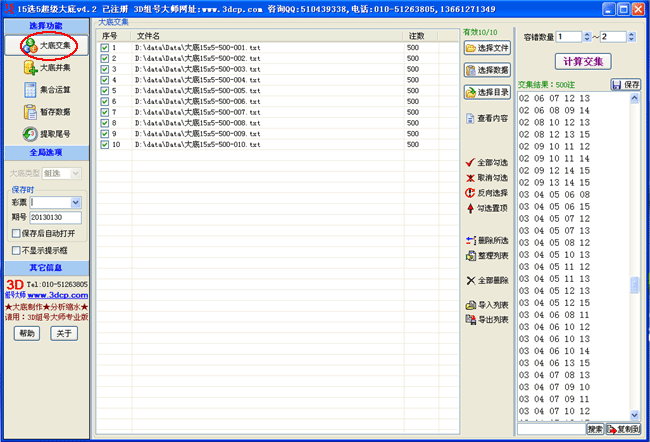 本系列软件提供的六大功能模块分别为:大底交集、大底并集、集合运算、暂存数据、拆分、合并3D号(4D版,5D版,6D版,7D版均支持、尾数提取(乐透型彩种均支持)。其中,大底交集功能支持多个大底的容错交集;大底并集功能适用于把多个大底累加合并到一起;集合运算功能提供两个集合之间的全部5种运算方式:求同(交集)、求异、相加(并集)、相减A-B和相减B-A;暂存数据部分提供了21个文本框可以用来暂时存放一些数据,鼠标的右键菜单提供了与文本框相配套的 全选、剪切、清空、单组转换、载入、保存、搜索取反等19项强大功能并支持容错功能。