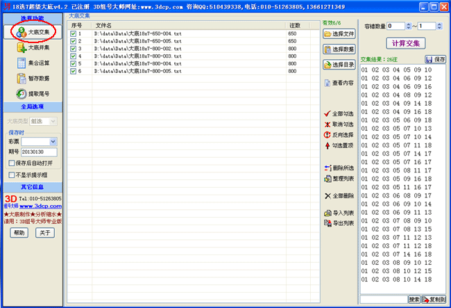 本系列软件提供的六大功能模块分别为:大底交集、大底并集、集合运算、暂存数据、拆分、合并3D号(4D版,5D版,6D版,7D版均支持、尾数提取(乐透型彩种均支持)。其中,大底交集功能支持多个大底的容错交集;大底并集功能适用于把多个大底累加合并到一起;集合运算功能提供两个集合之间的全部5种运算方式:求同(交集)、求异、相加(并集)、相减A-B和相减B-A;暂存数据部分提供了21个文本框可以用来暂时存放一些数据,鼠标的右键菜单提供了与文本框相配套的 全选、剪切、清空、单组转换、载入、保存、搜索取反等19项强大功能并支持容错功能。