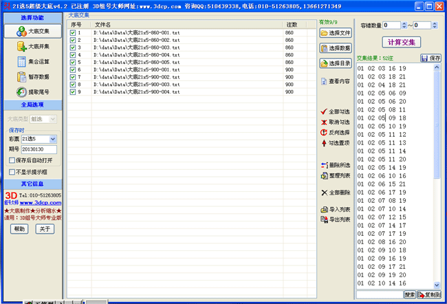 本系列软件提供的六大功能模块分别为:大底交集、大底并集、集合运算、暂存数据、拆分、合并3D号(4D版,5D版,6D版,7D版均支持、尾数提取(乐透型彩种均支持)。其中,大底交集功能支持多个大底的容错交集;大底并集功能适用于把多个大底累加合并到一起;集合运算功能提供两个集合之间的全部5种运算方式:求同(交集)、求异、相加(并集)、相减A-B和相减B-A;暂存数据部分提供了21个文本框可以用来暂时存放一些数据,鼠标的右键菜单提供了与文本框相配套的 全选、剪切、清空、单组转换、载入、保存、搜索取反等19项强大功能并支持容错功能。