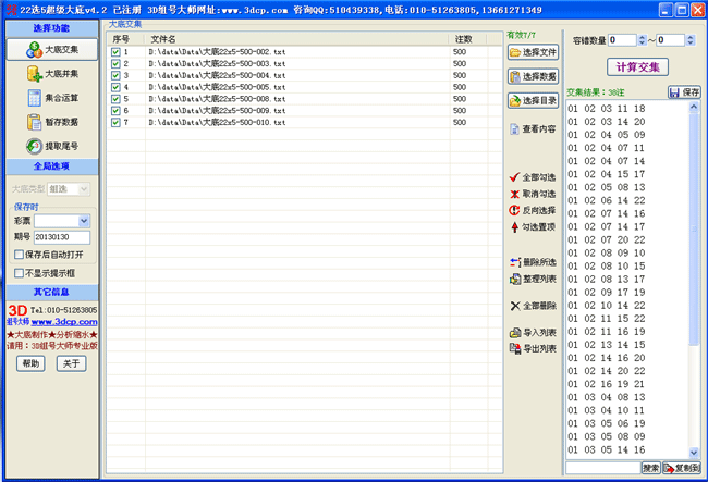 《22选5超级大底》软件是适用于体彩22选5乐透型的大底数据的计算与处理而研发,集大底交集、大底并集、集合运算、提取尾号等功能于一体,并提供:数据暂存、超级复制、超级粘贴等方便实用的多项特色功能。