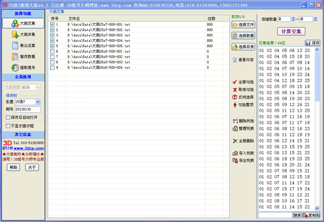 本系列软件提供的六大功能模块分别为:大底交集、大底并集、集合运算、暂存数据、拆分、合并3D号(4D版,5D版,6D版,7D版均支持、尾数提取(乐透型彩种均支持)。其中,大底交集功能支持多个大底的容错交集;大底并集功能适用于把多个大底累加合并到一起;集合运算功能提供两个集合之间的全部5种运算方式:求同(交集)、求异、相加(并集)、相减A-B和相减B-A;暂存数据部分提供了21个文本框可以用来暂时存放一些数据,鼠标的右键菜单提供了与文本框相配套的 全选、剪切、清空、单组转换、载入、保存、搜索取反等19项强大功能并支持容错功能。