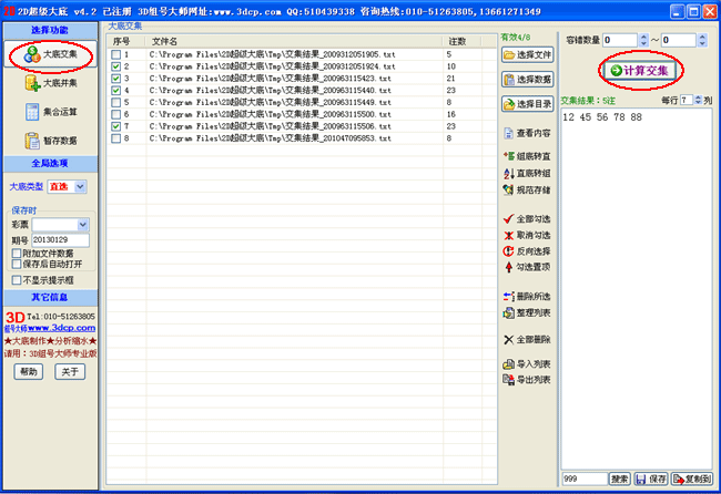 本系列软件提供的六大功能模块分别为:大底交集、大底并集、集合运算、暂存数据、拆分、合并3D号(4D版,5D版,6D版,7D版均支持、尾数提取(乐透型彩种均支持)。其中,大底交集功能支持多个大底的容错交集;大底并集功能适用于把多个大底累加合并到一起;集合运算功能提供两个集合之间的全部5种运算方式:求同(交集)、求异、相加(并集)、相减A-B和相减B-A;暂存数据部分提供了21个文本框可以用来暂时存放一些数据,鼠标的右键菜单提供了与文本框相配套的 全选、剪切、清空、单组转换、载入、保存、搜索取反等19项强大功能并支持容错功能。