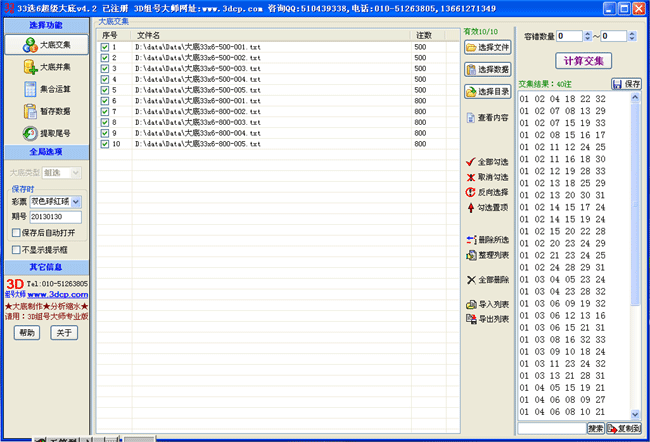 《33选6超级大底》软件是适用于双色球红球或33选6的乐透型彩票的大底数据的计算与处理而研发,集大底交集、大底并集、集合运算、提取尾号等功能于一体,并提供:数据暂存、超级复制、超级粘贴等方便实用的多项特色功能。