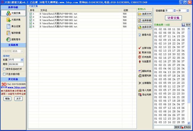 本系列软件提供的六大功能模块分别为:大底交集、大底并集、集合运算、暂存数据、拆分、合并3D号(4D版,5D版,6D版,7D版均支持、尾数提取(乐透型彩种均支持)。其中,大底交集功能支持多个大底的容错交集;大底并集功能适用于把多个大底累加合并到一起;集合运算功能提供两个集合之间的全部5种运算方式:求同(交集)、求异、相加(并集)、相减A-B和相减B-A;暂存数据部分提供了21个文本框可以用来暂时存放一些数据,鼠标的右键菜单提供了与文本框相配套的 全选、剪切、清空、单组转换、载入、保存、搜索取反等19项强大功能并支持容错功能。