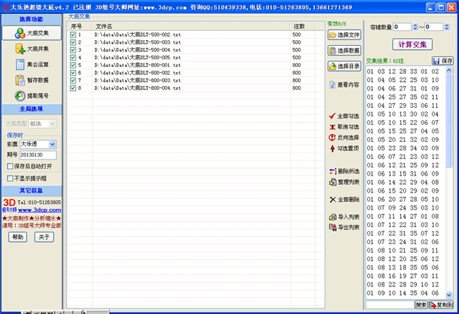 在多年的免费版大底交集过滤工具的研发基础上,3D组号大师软件的研发小组积累了丰富的大底软件开发经验,使新推出的超级大底系列软件无论是在内部算法及执行效率等方面都进行了极大的优化,使算法设计更加成熟,运算速度更加快捷,界面功能也更加人性化。