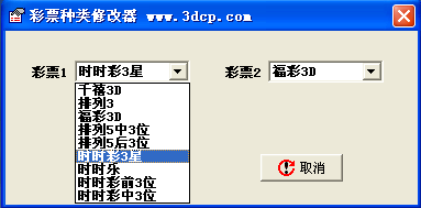 目前3D组号大师加密锁版支持的彩种有:福彩3D,体彩P3,时时彩,时时彩前三,时时彩中三,时时乐,排列5中三位,排列5后三位等,您都可以在彩种修改器里选择,今天我们以时时彩为例为大家讲解。如下图选择时时彩三星:
