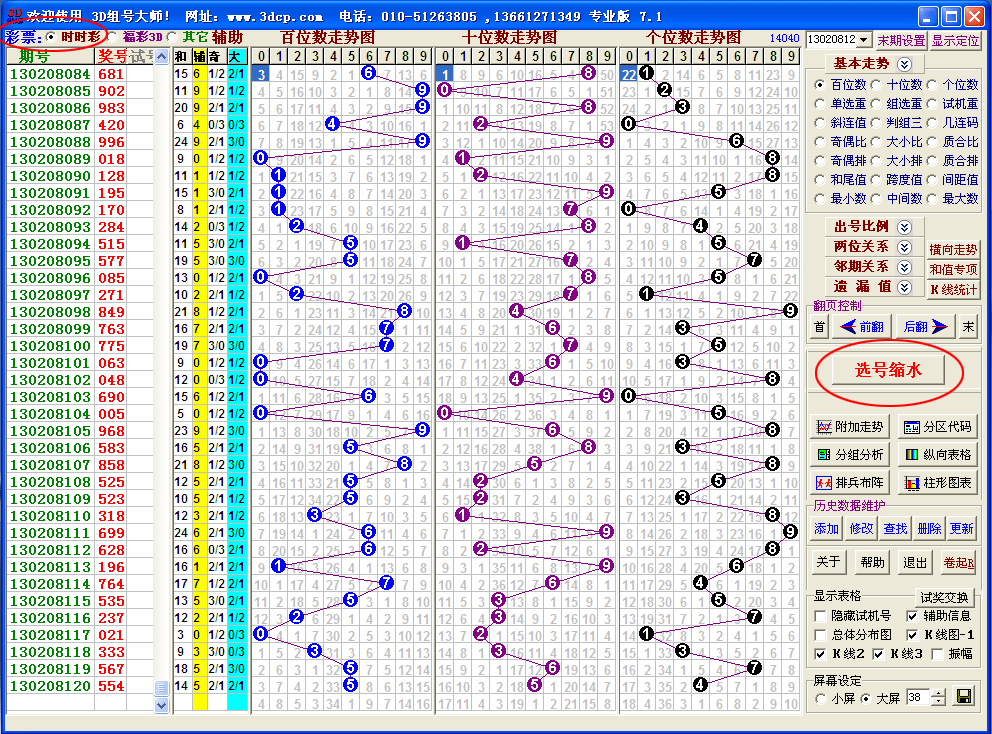 如下是软件打开的主界面,目前我们选的彩种是时时彩,3D组号大师软件主界面主要是走势图,有100余种,支持横向和纵向的,配有走势图的开出次数和遗漏统计,还有一些专项分析等等,这些功能我们以后再讲,我们继续今天的讲解,点“选号缩水”如下图(点击看大图):