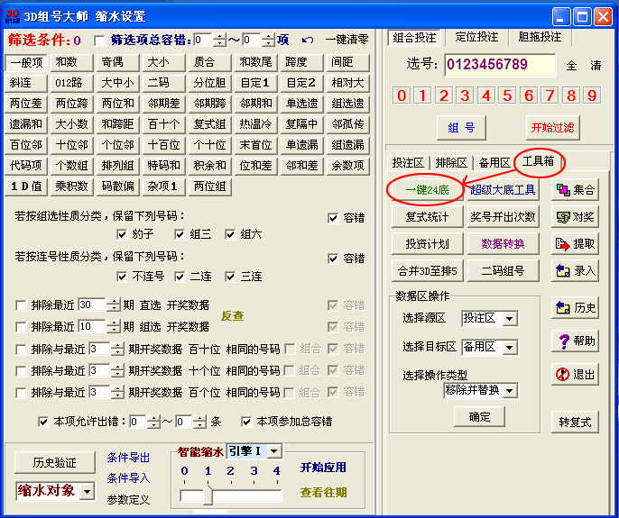 点选号缩水后,我们进入缩水设置界面,这里主要是进行筛选条件设置的,3D组号大师加密锁版支持的缩水条件有53种,支持2级容错设置,就是说每个小项可以设容错,53大项也可以再设容错,在您设错条件的情况下也可以最大程度上保留住奖号,这些功能我们以后再详细讲。好,我们继续今天的讲解,点工具箱,看到“1键24底”按钮,如下图。