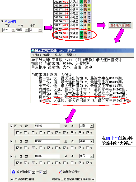 例如,当单选排列选为百位按“大小”,十位按“奇偶”,个位按“边中”时,末期06264期已经连续两期为“大偶边”,通过“查看最大连出值”可知,“大偶边”排列的最大连出3期,上次发生在04年,则06265期继续开出“大偶边”的可能性很小,可以排除“大偶边”排列类型。