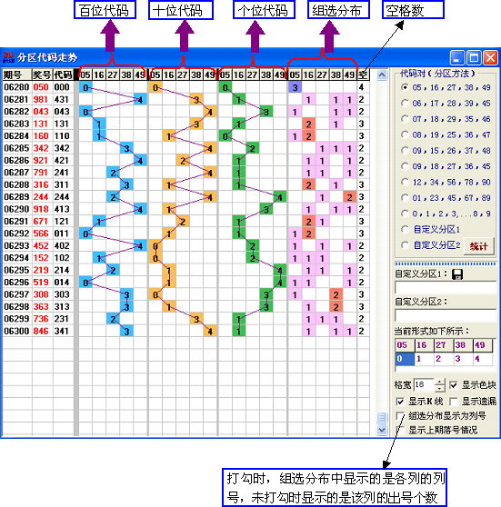 按多种分区方法,显示奖号的代码走势图。