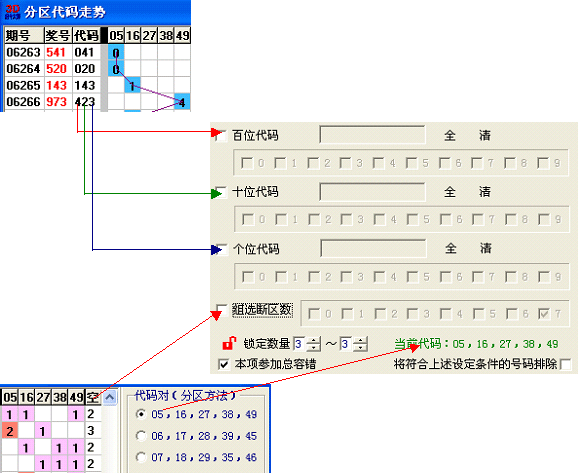 由3.6版的代码表改进而来,提供八种对子码及两种自定义方案。在筛选条件中可对代码直接缩水。可以显示分位单选走势图、组选分布图、空区数及统计等。