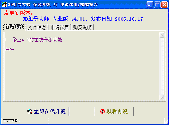 点击 “立即在线升级”,开始下载更新文件,当提示在线升级成功之后,可关闭本升级程序,重新运行3D组号大师主程序即可。